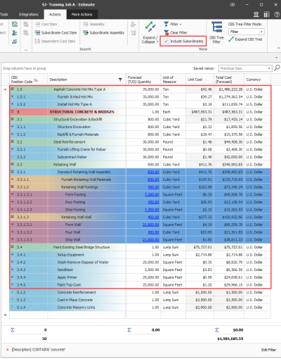 Include subordinates in the CBS filter – A new Include Subordinates option is available when applying filters in the CBS. When selected, subordinate items under the filtered superior items are shown even if they do not match the filter text. This option is especially useful when estimating large CBS structures where similar work shows across multiple areas, preventing you from having to scroll to find and update superior related items.