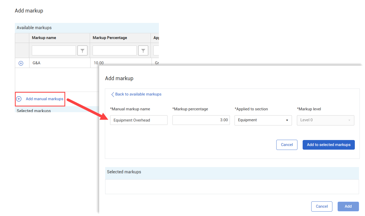 If a markup is not already configured, click Add manual markups, and then enter the markup details.