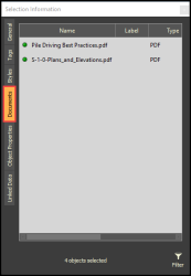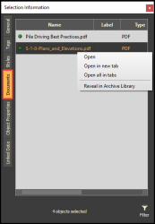 There are additional actions that can be taken within the Documents tab: Filter the Selection, Open the Documents, or Reveal the documents in Archive Library.
