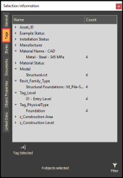 There are additional actions that can be taken within the Tags tab: Filter the Selection, Select similar tags, and Tag Selected objects with a new tag.