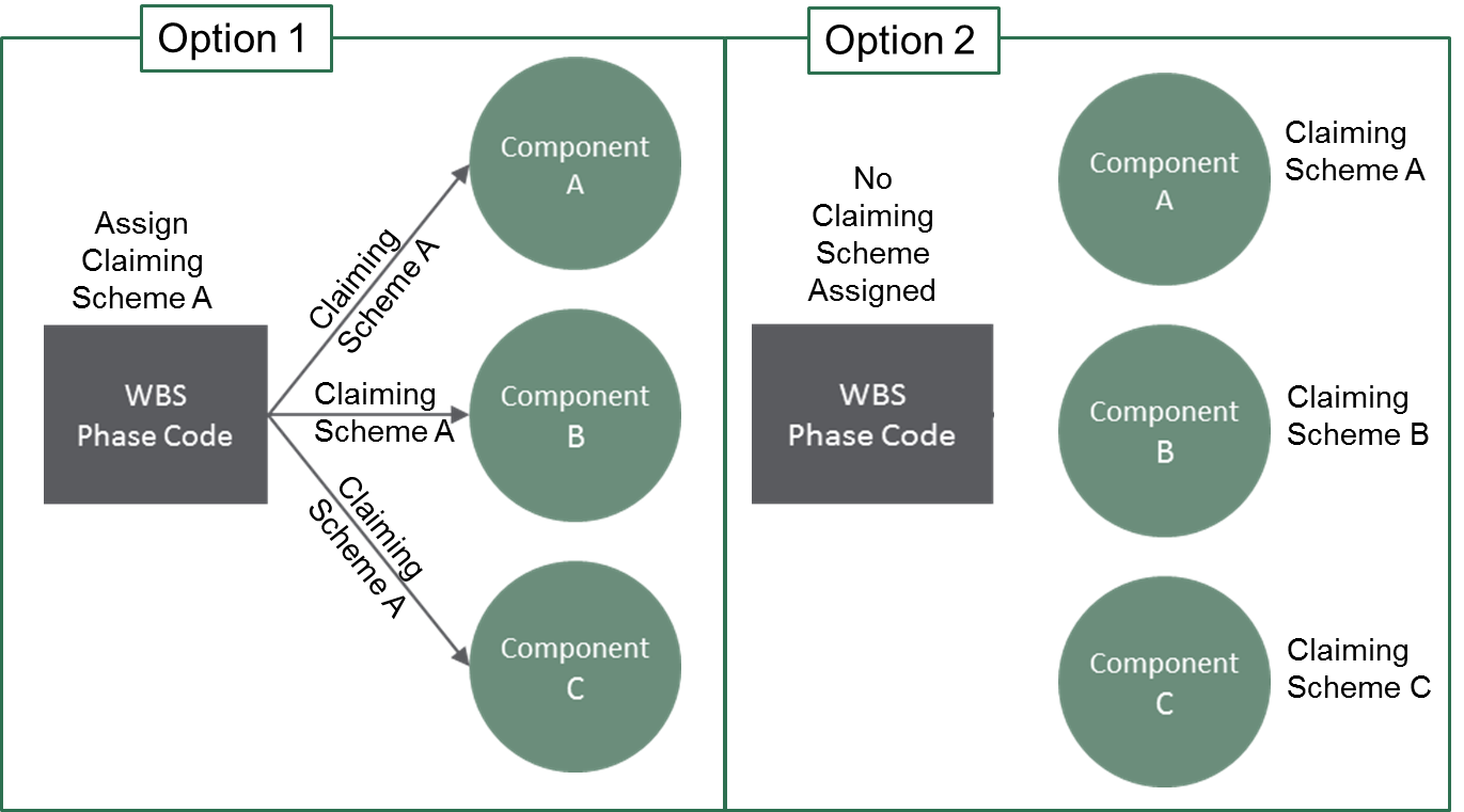 To assign claiming schemes at the component level, you must assign them to each component individually. If you assign a claiming scheme at the WBS level, then every component assigned to that WBS will inherit the same claiming scheme.