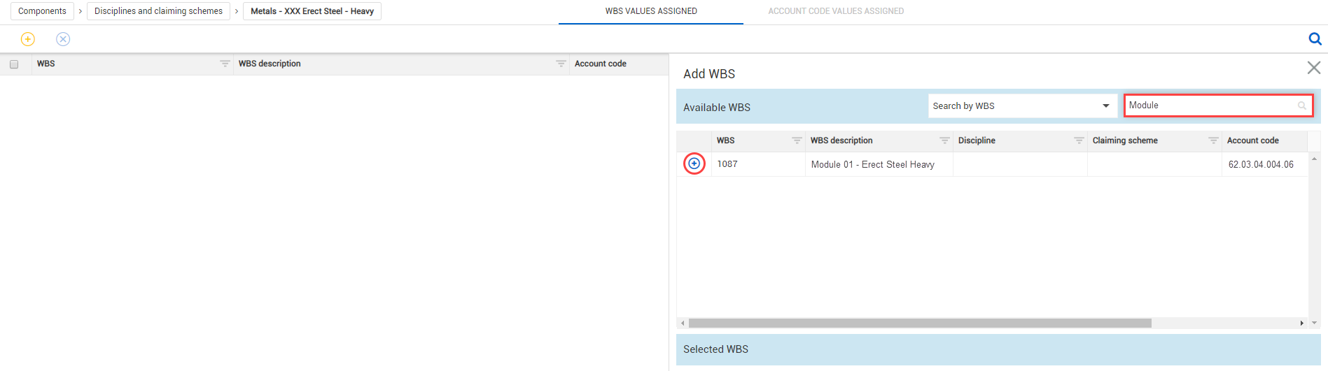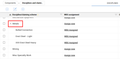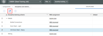 After you have assigned an account code to a claiming scheme, select the check box next to the claiming scheme. Then, select the Map Account Code to WBS icon in the top right of the Disciplines and Commodities tab to automatically map WBS to the associated account code. There, you can select multiple claiming schemes to map all of them at the same time.![]()