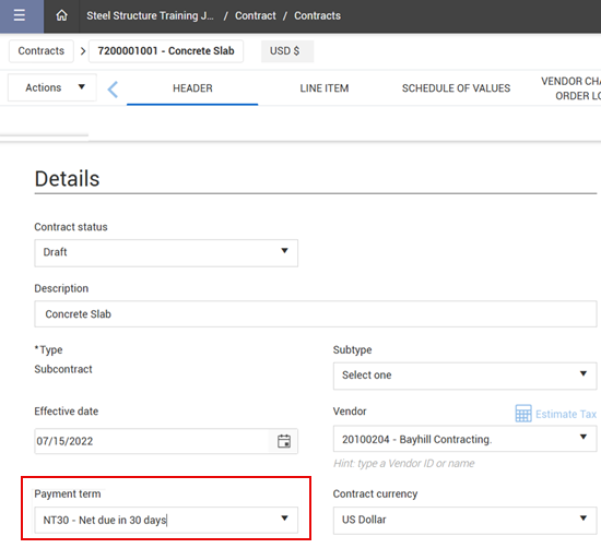 Within the InEight Contract application, on the Header details of a contract, you can select the payment term for the contract from a drop-down list. If the contract vendor has a default payment term associated with it in the master data library, then the vendor’s default payment term is populated.
