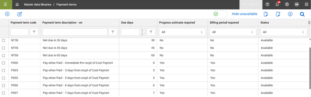 By default, the Hide unavailable toggle is set to On, which filters the list to show only the available payment terms that can be assigned. Payment term records cannot be deleted but the status of a payment term record can be set to Unavailable, which prevents the payment term from being used and assigned. However, if a payment term is already indicated on a contract within a project, then it will still be available in that contract but will not be available for future contracts.