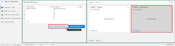 Management console (web only) – A new page lets you manage toolbox talks for general, safety, environmental, and quality topics and also to attach files to daily plans.