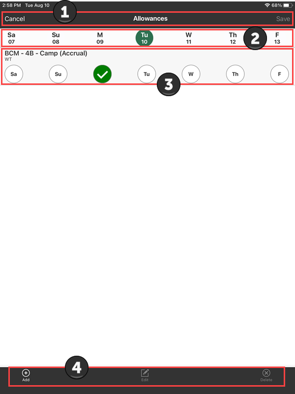 Actions | Tap these buttons to add, edit, or delete an allowance time card. |