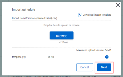 3. In the Import schedule dialog box, drag and drop the file you want to import, or click Browse to navigate and select the file.