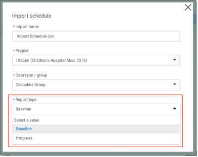 8. From the Report type drop-down list, select a value, where the options are Baseline and Progress