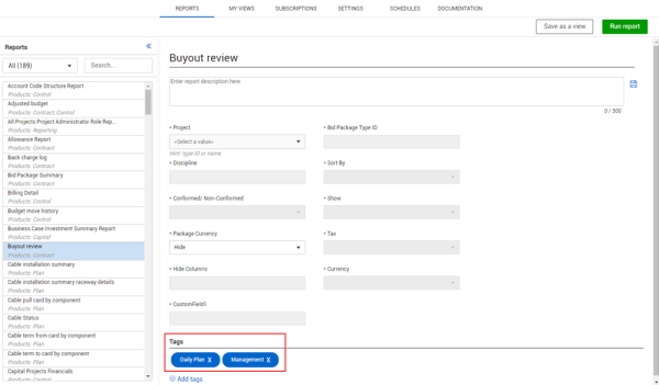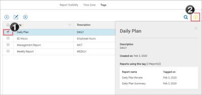 To view reports associated with a specific tag, go to Settings > Tags. Click a tag, and then click the Show information details icon.