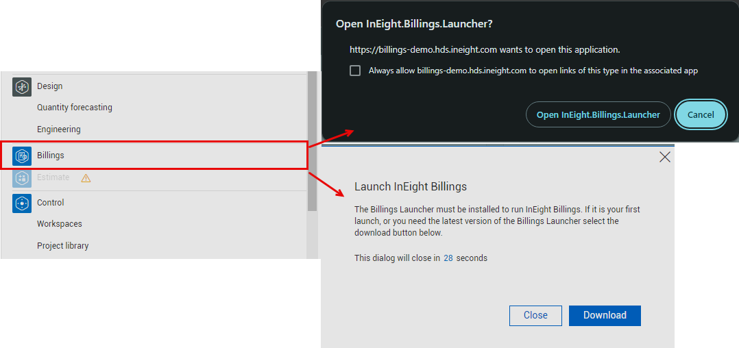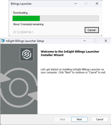 2. If you are using Billings for the first time, select Download, and then select Next (or Open) to start the one-time Billings Launcher download.