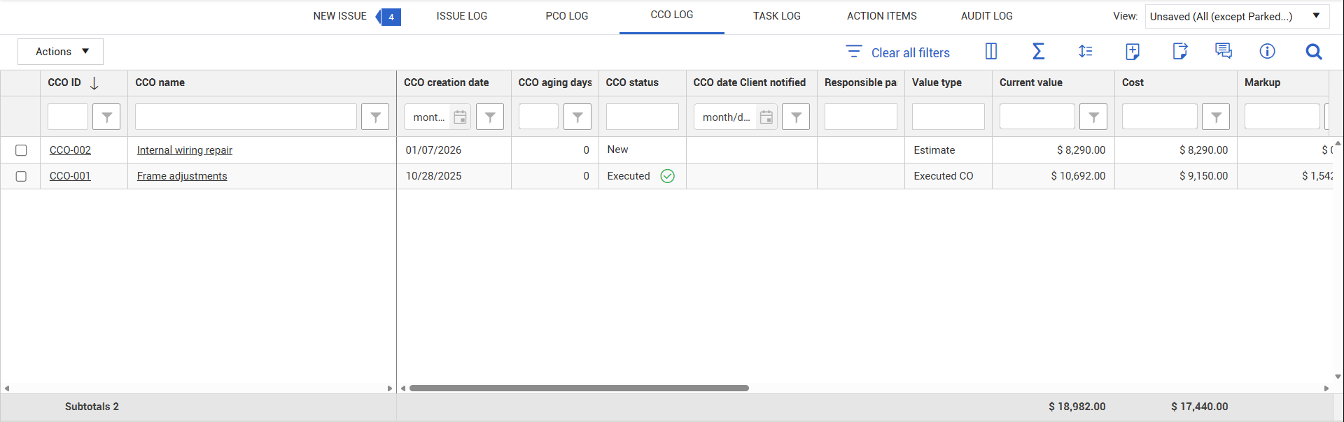 The CCO Log provides subtotals at the bottom of the register for total number of CCOs and total current value of the CCOs (based on those CCOs that have locked pricing – ROM, Estimate, Agreed)