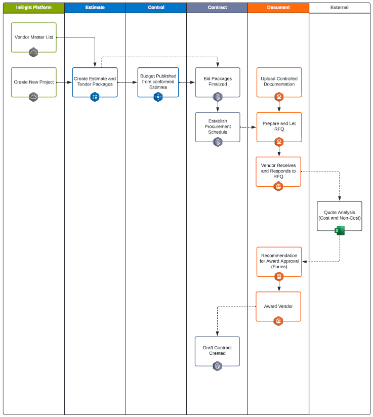 This workflow shows the business process for developing contracts before they become awarded, from initial tender estimates, to bid packages, and finally to become draft contracts.