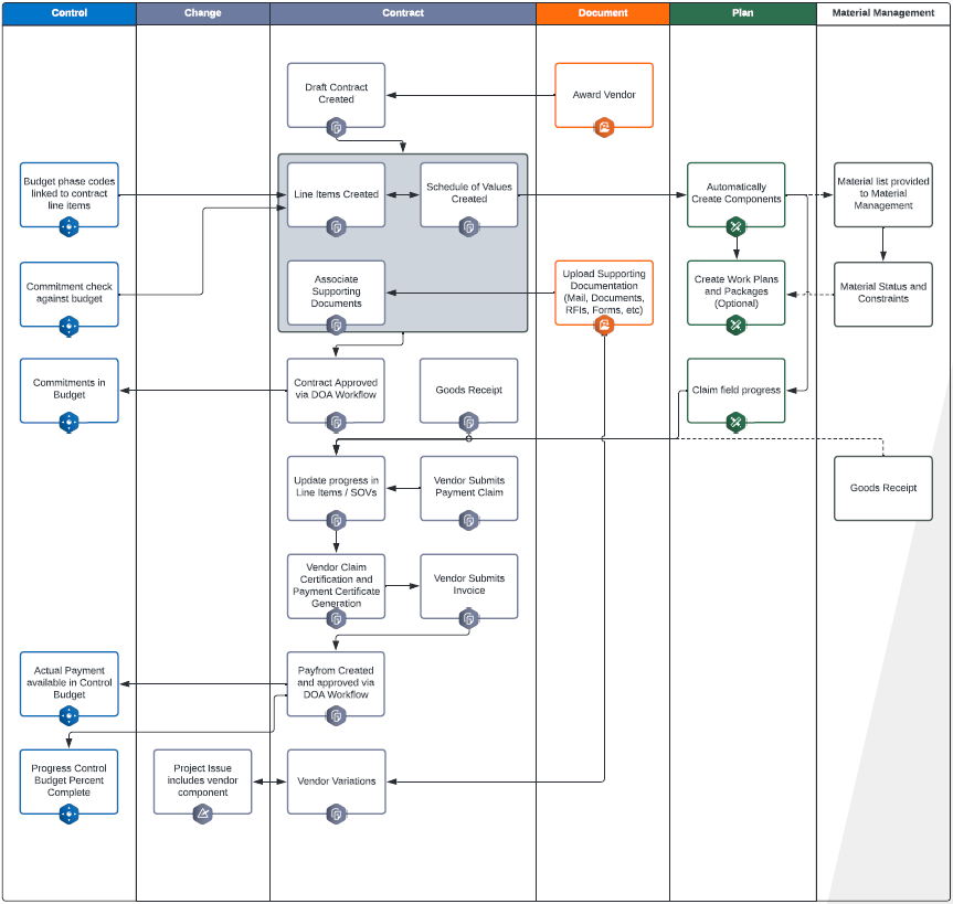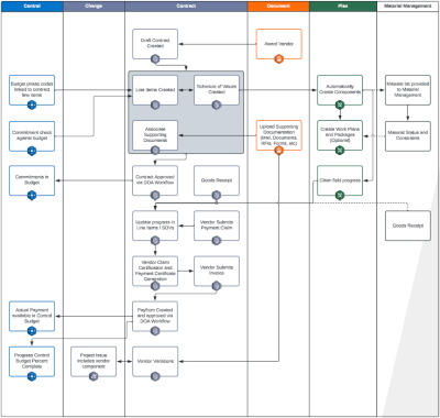 This workflow shows the business process for managing contracts post-award, including management of contract commitments, claiming, and payments.