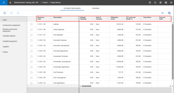 InEight Control refers to labor, equipment, materials, installed equipment, and supplies as resources. These resources are used as the basic building blocks for detailing the estimated costs which create your budget.