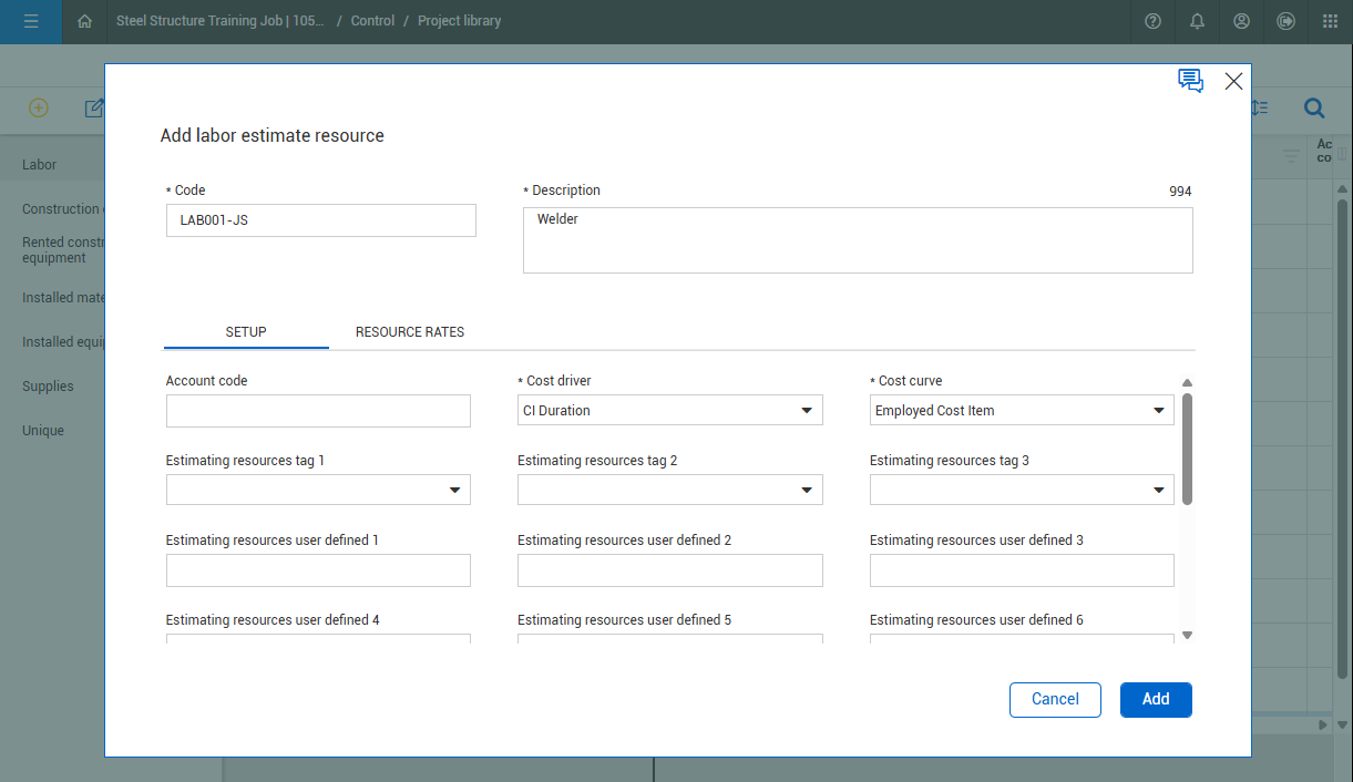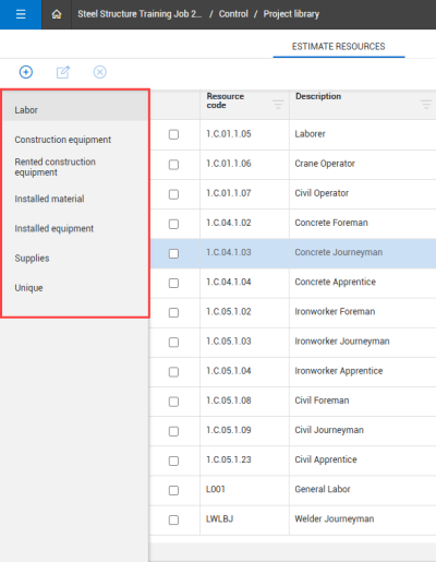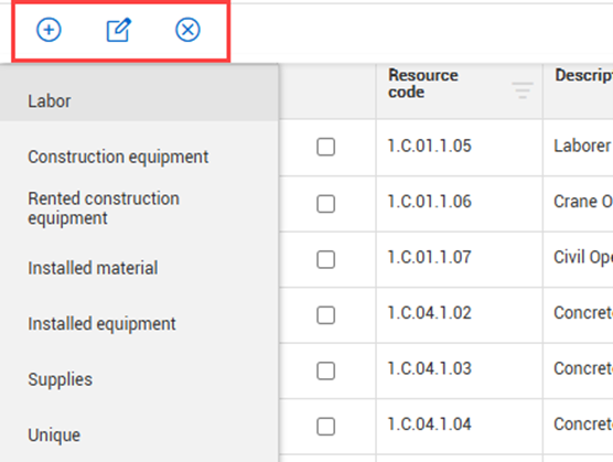 To add an estimate resource to the Estimate Resources library, you must first choose the resource type in the left-side section (Labor, Construction equipment, etc.), and then click the Add estimate resource icon. In the Add estimate resource dialog box, enter the applicable required and optional resource data, and then click Add to add the estimate resource.