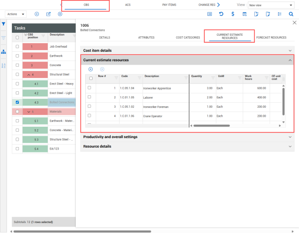 On the Cost item details slide-out, select the Current Estimate Resources tab.