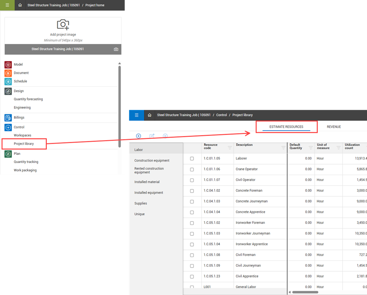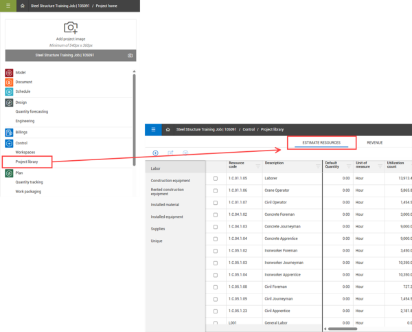To access the Estimate resources page, go to the project home page, and then click Project library. The Project library page opens and shows the Estimate Resources tab.