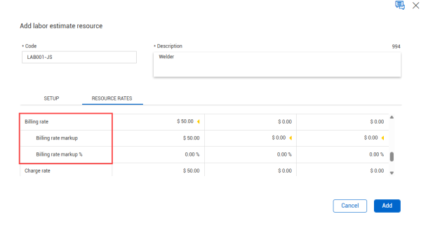 In the Resource Rates tab, you can import, modify, and add billable rates to estimate resources. This is particularly helpful for time and material or cost plus contracts to drive accurate invoicing.