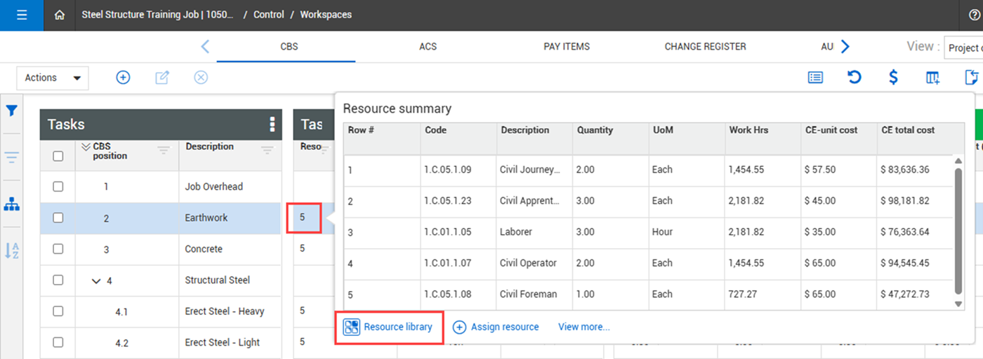 You can also access Estimate Resources from the CBS page. In the CBS page, select a line item and then hover over the resource number in the Resources column of the Task details data block. In the Resource Summary dialog box, click Resource library to open the Project library.