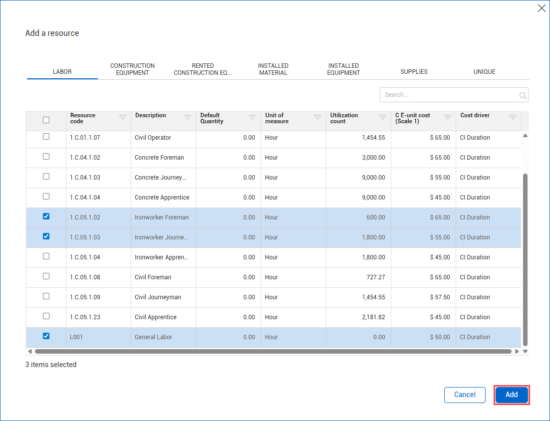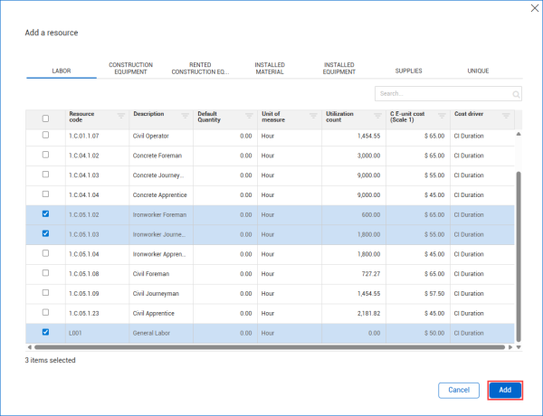 In the Add a resource dialog box, select the resources to add to the cost item, and then click Add.