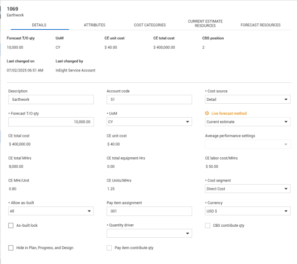 Like the Details, Attributes, and Cost Categories tabs, you access the Forecast Resources tab from the Cost Item Details slide out panel.
