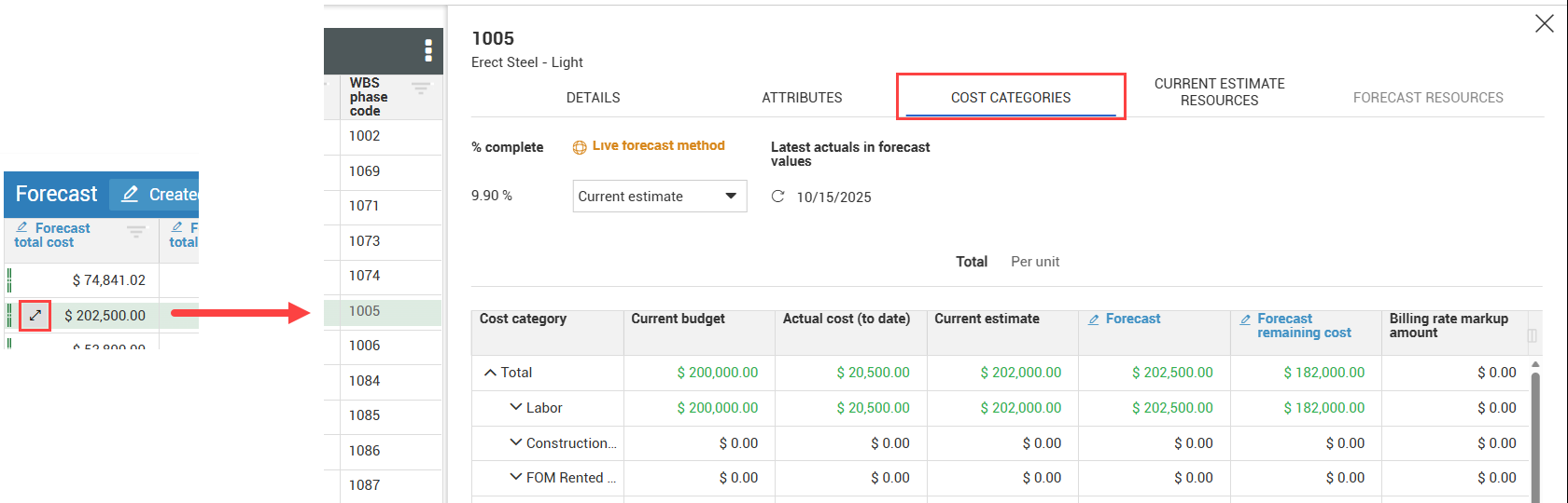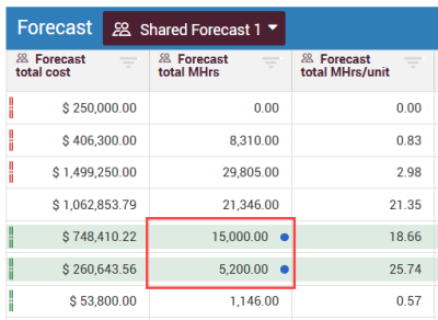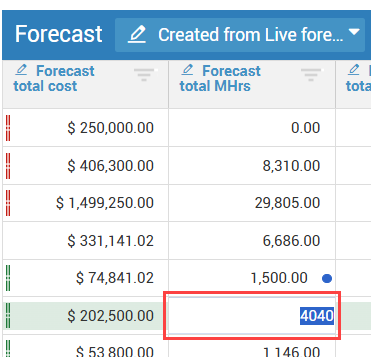 1. From the private forecast data block, select the cost items with updated values.