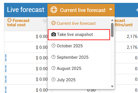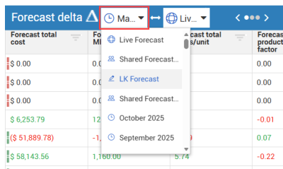 Additionally, you can access previous Live forecast snapshots from the drop-down menu.