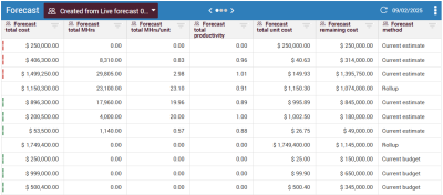 All forecasting adjustments are made in the Forecast data block. This block includes a variety of columns that show cost, man-hours, and productivity, as well as forecast methods.
