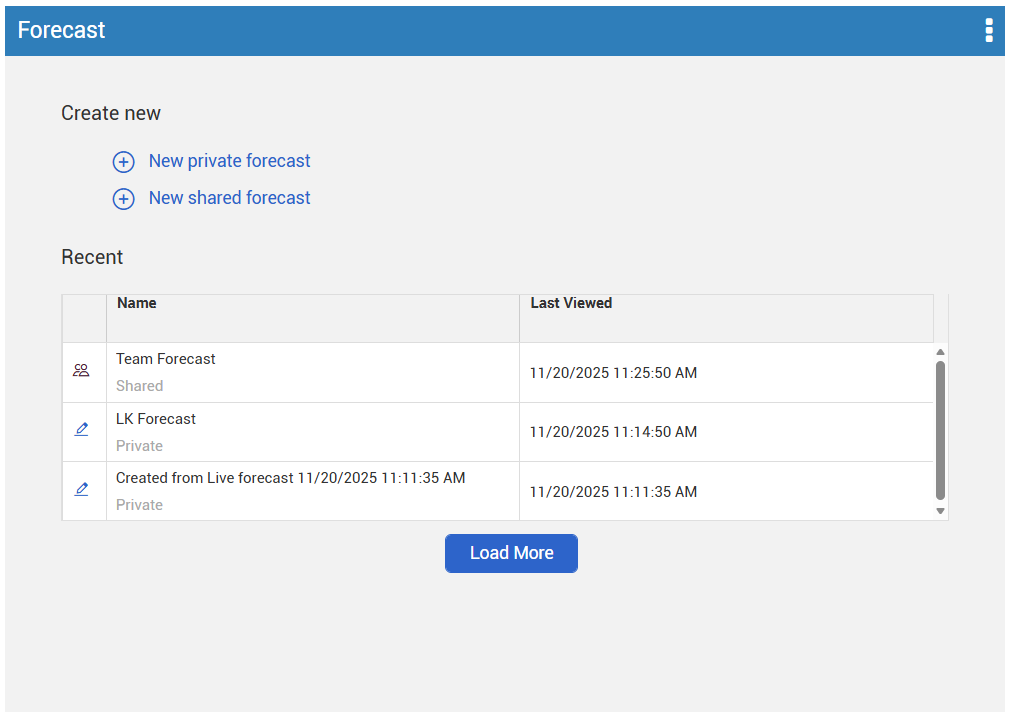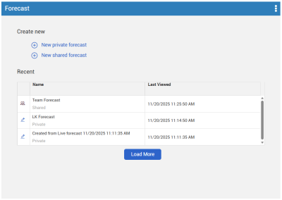 When you first access the Forecast data block, either by opening the Forecasts view or by adding the data block to your view, it will show several options for loading a forecast. Select New private forecast or New shared forecast to load a new forecast based off the Live forecast. You can also select an existing forecast under Recent.
