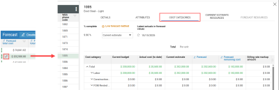 To view or adjust cost categories for a cost item, click the View cost categories icon inside a cell. This opens the Cost Categories tab of the cost item details slide-out panel.
