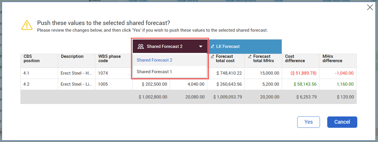 3. A dialog box opens where you can review the changes. Select a shared forecast from the drop-down menu.
