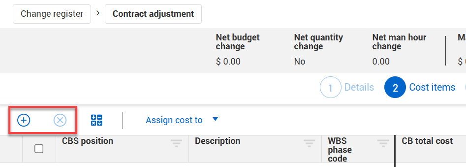 On Cost items, add the cost items involved in the contract adjustment and enter their adjustment amounts. Click the Add cost item icon to add cost items. To remove a cost item, click the Remove cost item icon.