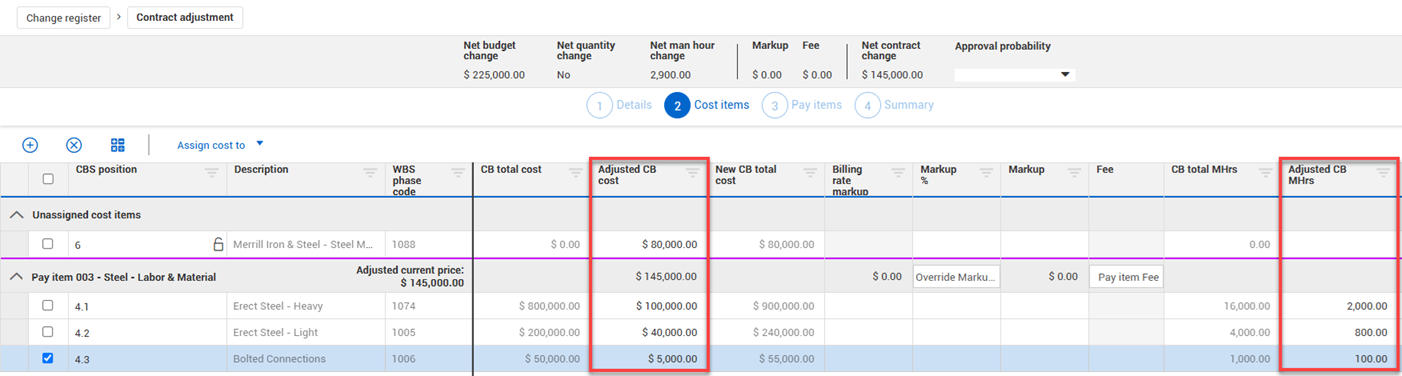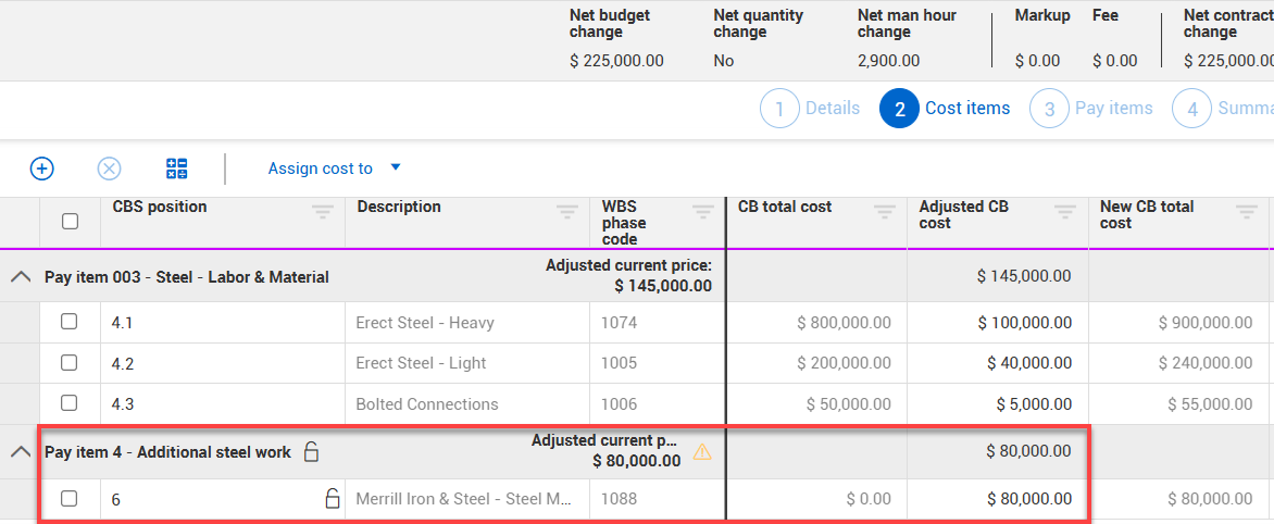 Unassigned Cost Assigned to New Pay Item scenario - If the change order requires a significant scope change, the owner may want to delineate it as a new pay item in the contract. Within the budget, the contractor will likely add a new cost item to represent the new work and assign it to the new pay item. This assignment can be made prior to the contract adjustment but can also be done within the contract adjustment record.