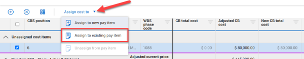 Unassigned cost assigned to existing pay item scenario - There may be times when the change order requires a new cost item for the budget, but that cost item will pertain to an existing pay item. For those cases, you can select Assign cost to > Assign to existing pay item.