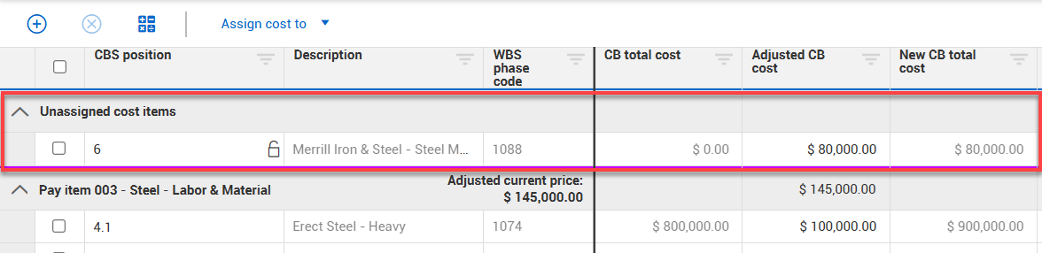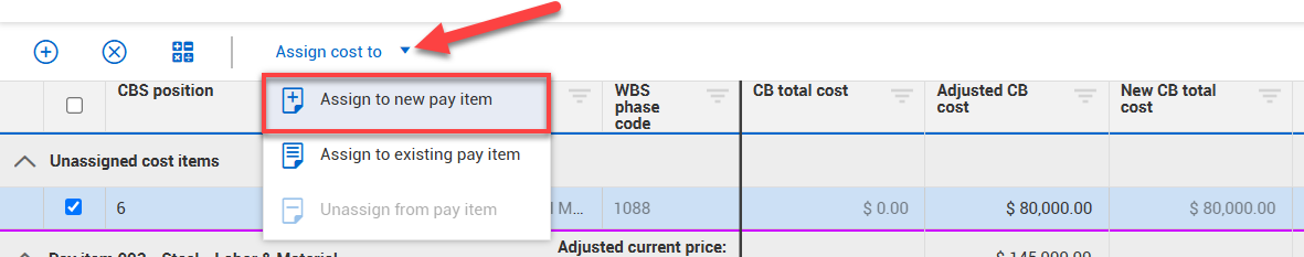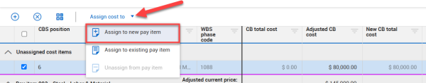 To assign an unassigned cost item to a new pay item, select the cost item, then select Assign cost to > Assign to new pay item.