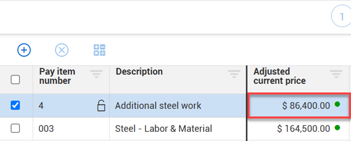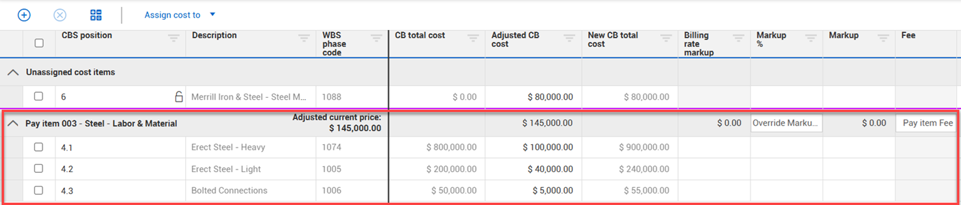 Cost item already assigned to pay item scenario - If the contract adjustment affects cost items that already exist in your budget, they will likely already be assigned to pay items. As you adjust the cost items, including adding markup and fees, the record will calculate the adjusted current price for the pay items the cost items are assigned to.