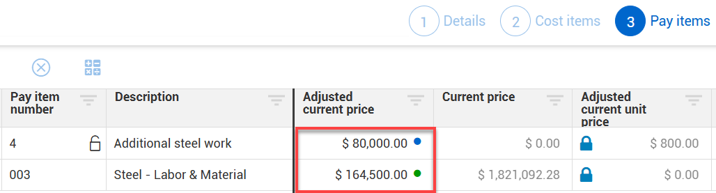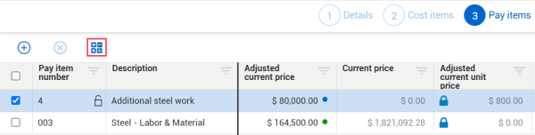 After adjustments, markup and fees are added, and pay item assignments made, click Next. The Contract adjustment wizard opens to step 3, Pay items. On Pay items, you can review the pay items related to the contract adjustment and make further adjustments to the current price and quantities as needed.