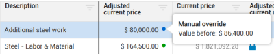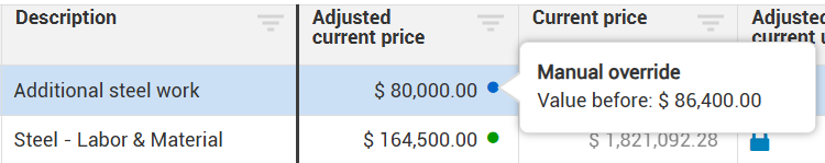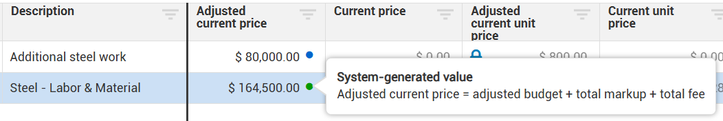 Green dot - Indicates the Adjusted current price was calculated automatically from the Adjusted current cost + total markup + total fee. You can view the calculation when you hover over the dot.