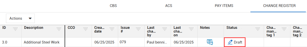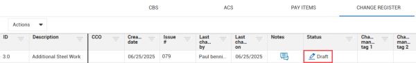 Draft - If the contract adjustment is not yet complete or ready for review, select Draft to save it for later. This will save the adjustment as a draft in the Change Register. At any time, you can edit the adjustment by selecting the Edit icon for the record on the Change Register.