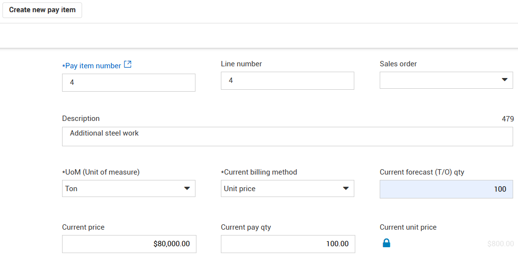 The Create new pay item window opens. Add pay item details as needed. In this case, the adjusted cost amount is added in the Current price field, since markup and fees have not yet been considered.