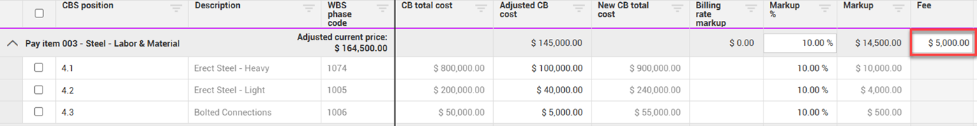You can also add a flat fee (for example, for permits, extra administration, or supervision). Fees are added only at the pay item level. The sum of your markup and fee is your planned profit.