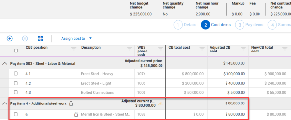 In the example above, a new cost item was added in the CBS for additional steel material (Merrill Iron & Steel – Steel Material) prior to creating the contract adjustment, so it is available to select.