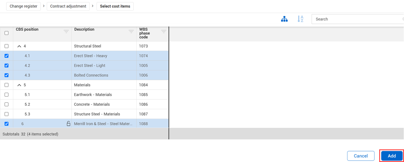 Click Add cost item. The Select cost items list opens. Select the cost items related to the contract adjustment, and then click Add.
