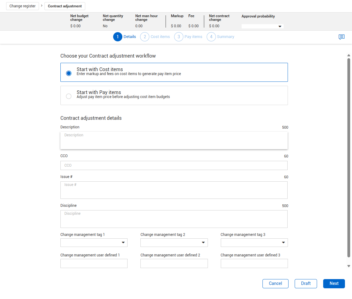On Details, select the Start with Cost items workflow option, and then add contract adjustment details as needed.
