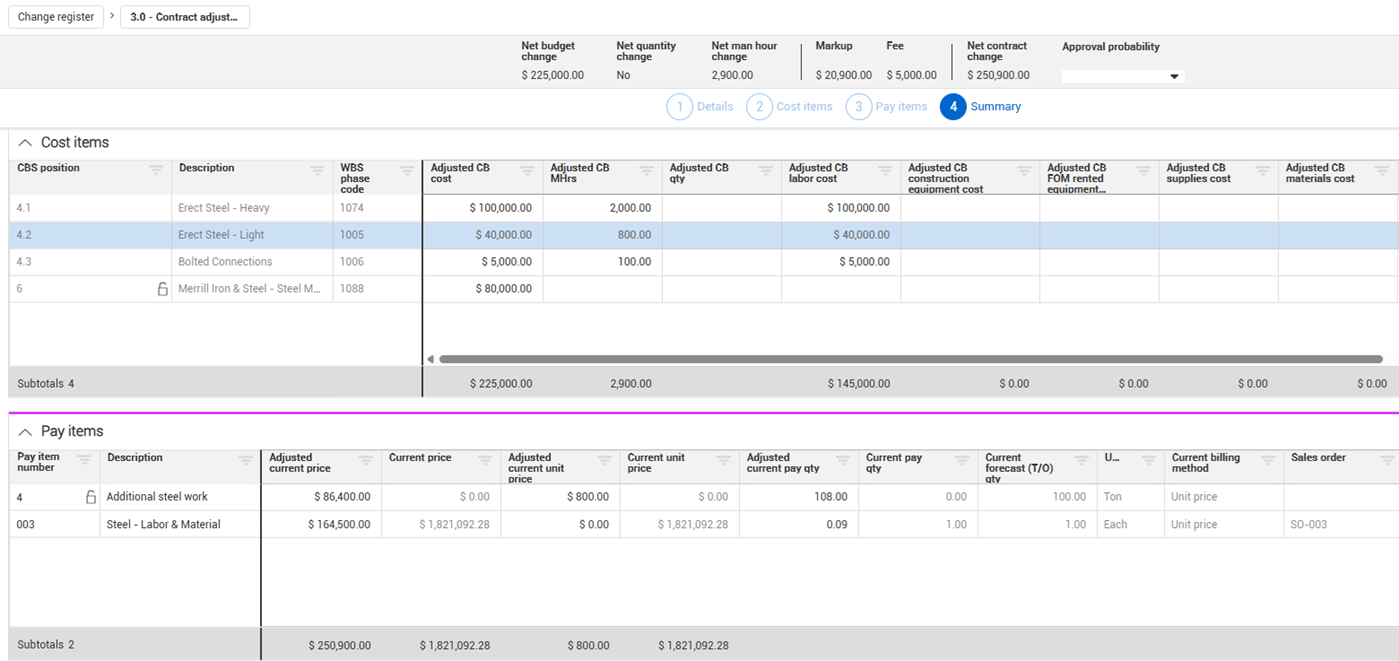 In Summary, you can review the cost items and pay items summary involved in the contract adjustment with their adjusted values for a final review. Click Submit to send it to the Change Register for review and approval. With the applicable permissions, you can approve the contract adjustment directly from the record’s Summary step by clicking the Approve button.