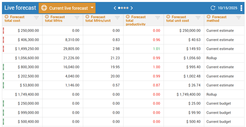 The Live forecast is the official project forecast used for financial reporting. It is automatically shared with all project members and managed through its own data block.