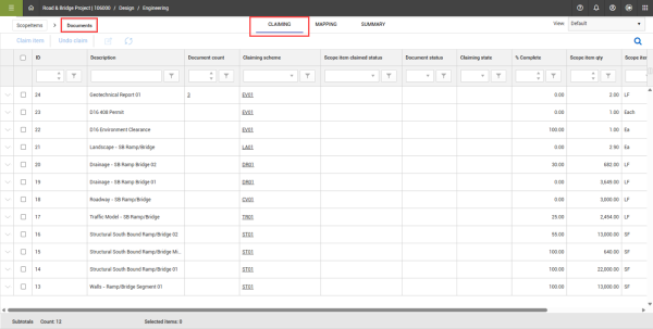 If multiple documents are associated with a scope item, Design looks for the furthest completed document status of all documents when compared to the statuses on the scope item’s claiming scheme.