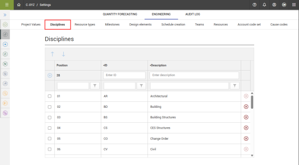 Add – Enter an ID and Description, and then click the Add discipline icon.