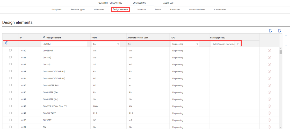 To add a new design element, enter a unique name, select a UoM, and an associated EPC option (engineering, procurement, or construction). You can also select a parent design element to group elements together. Click the Add design element icon.