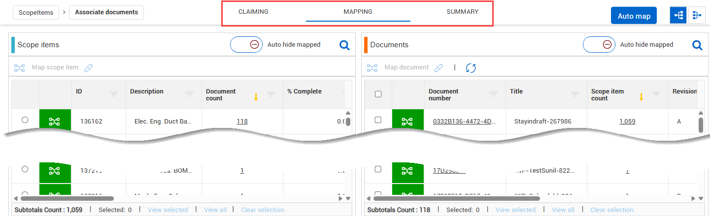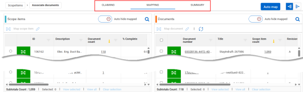 Mapping tab– You can view and associate documents to scope items.